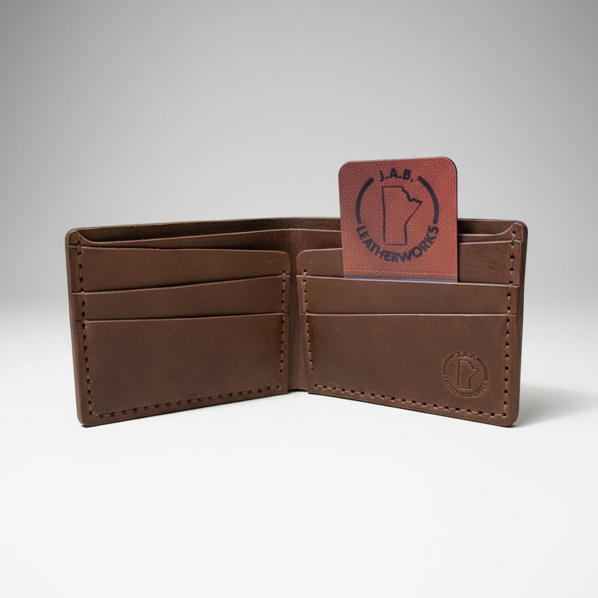 This J.A.B Leatherwork - Six Pocket Bi-Fold Wallet utilizes premium leather and a bi-fold design to provide durability and functionality. With six pockets, it offers ample storage for cards and cash. Expertly crafted, this wallet is perfect for the stylish and practical individual.