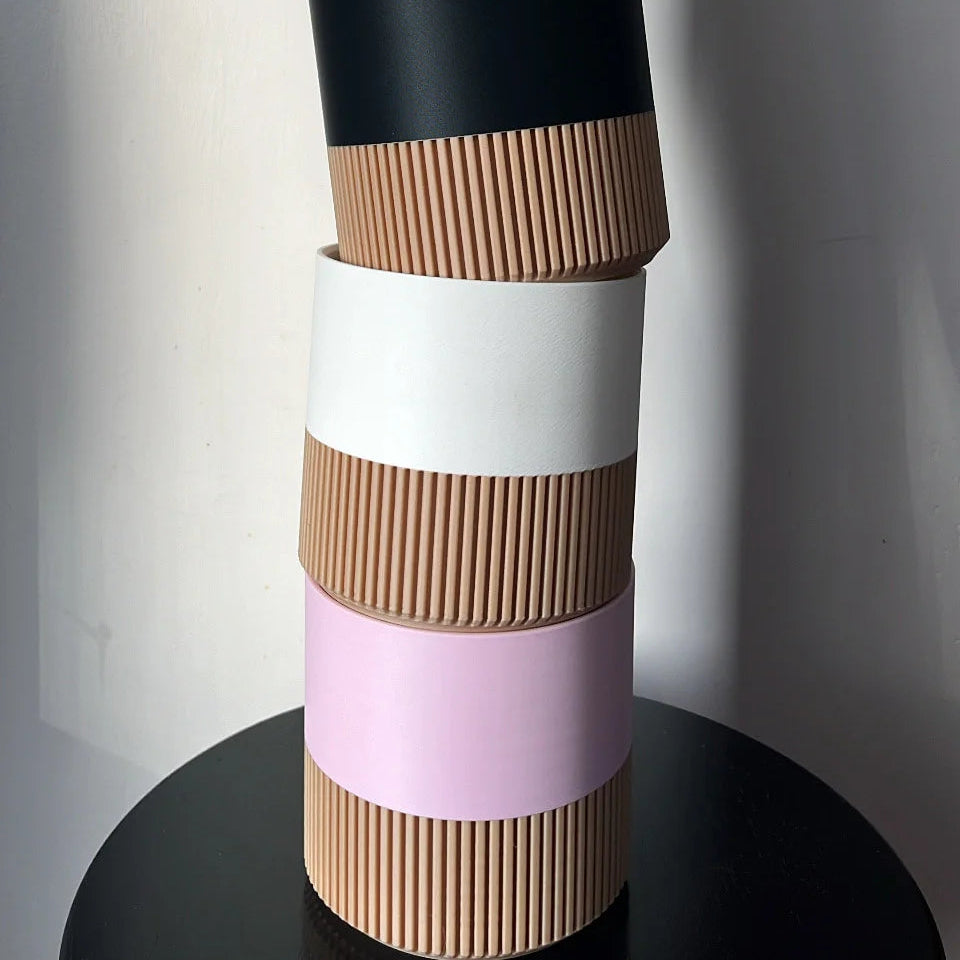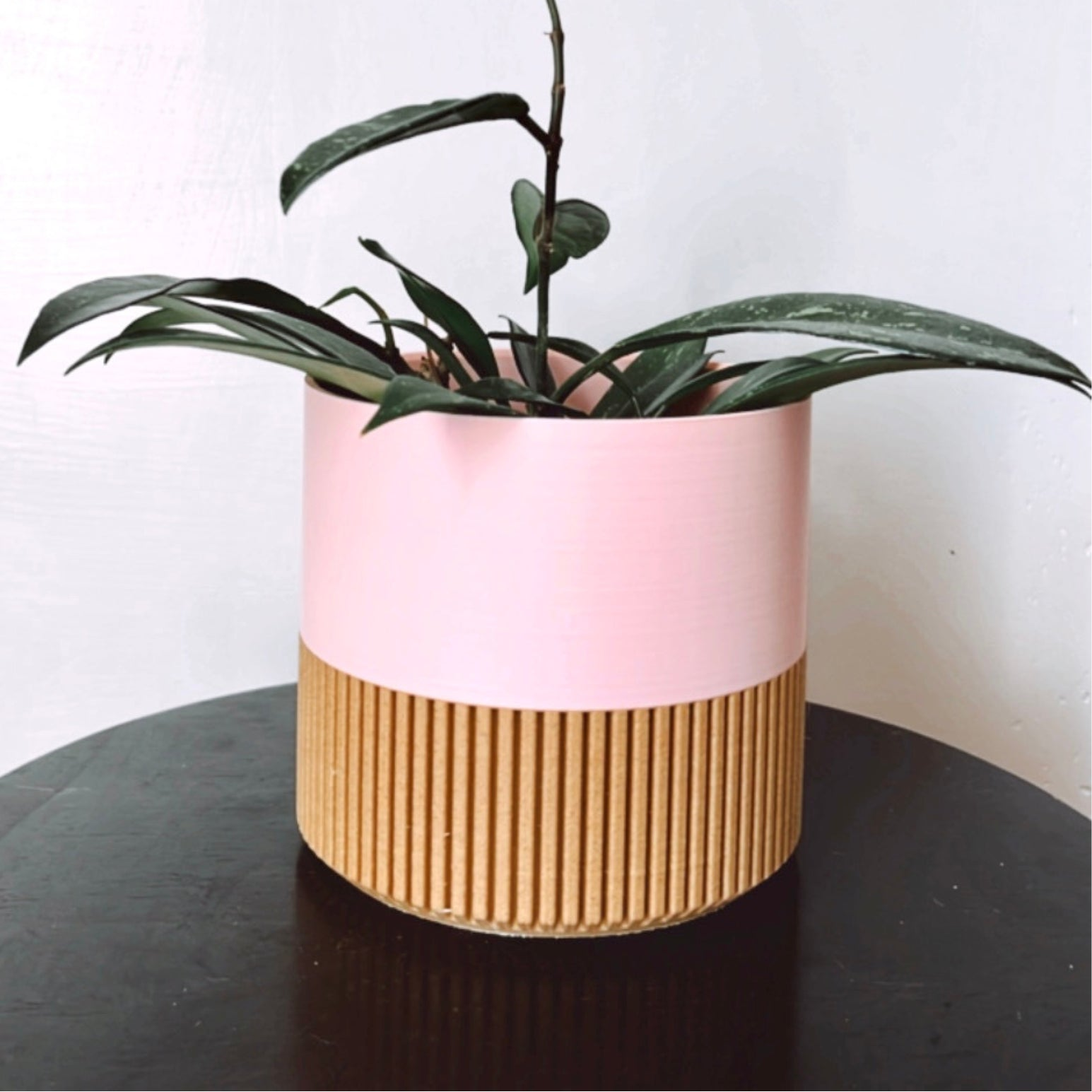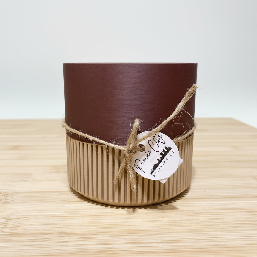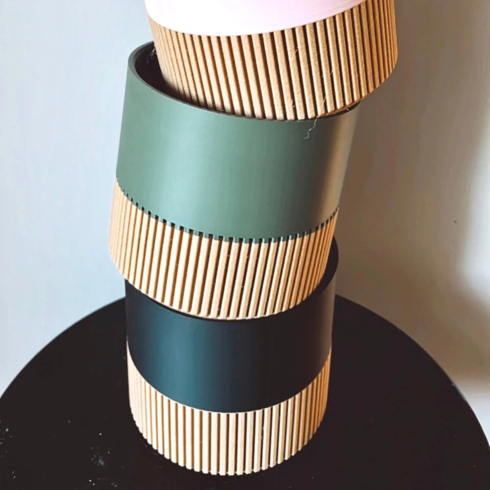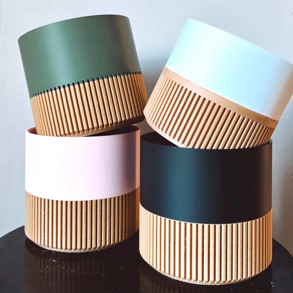 Two-toned Wood & Colour Block 3D printed minimalist indoor plant pots. Each pot is handmade and for indoor use. Material is Eco-friendly plant-based plastic PLA, biodegradable and non-toxic filament material. The Wood is sourced from cedar trees found on Vancouver Island, British Columbia.