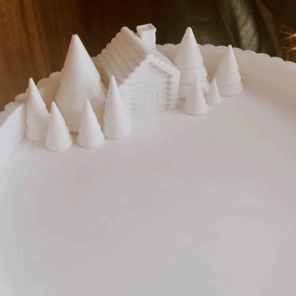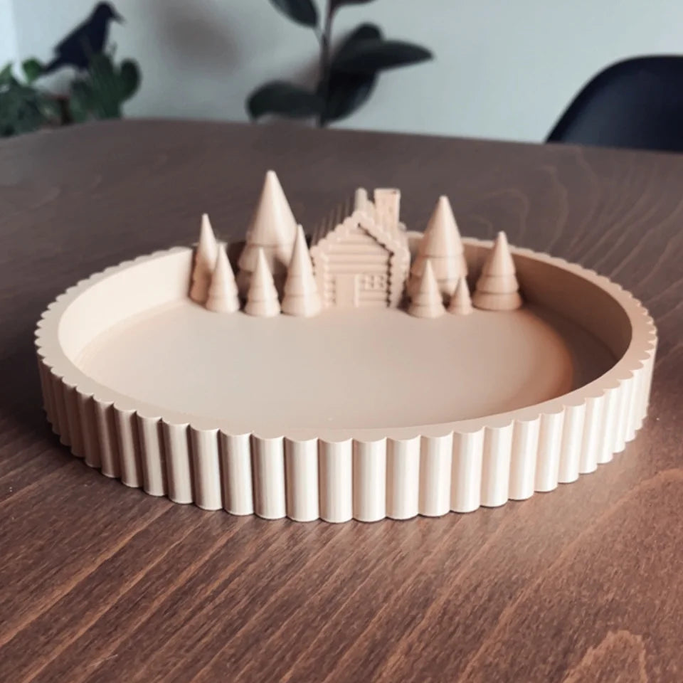 Designed and 3D printed in a sleek and modern pattern with a single log cabin and pine trees on either side in varying heights along the left side of the tray. These decorative Winter Village trays are available in earth tone colours to match the aesthetic of the tray style.