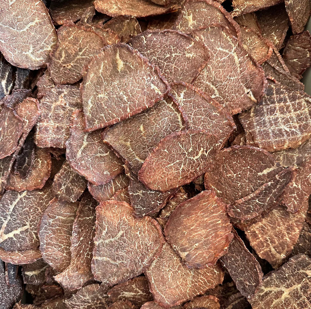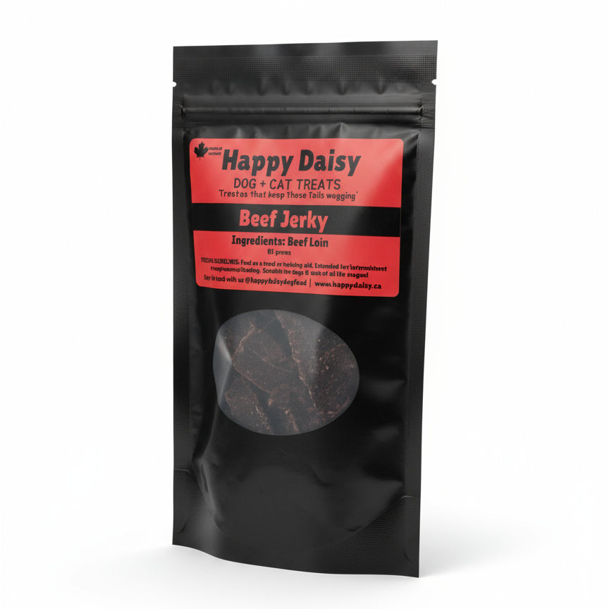 Beef Jerky - Upgrade your dog's snack game with our Beef Jerky – a high-protein, flavorful treat that will keep them satisfied and nourished. Made from human grade whole loin Canadian beef and packed with nutrients, our jerky will keep your pup happy and healthy. Perfect for training or just a delicious reward!