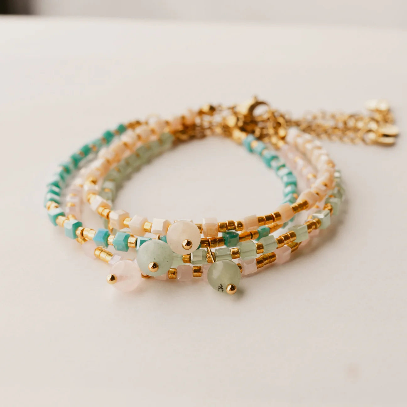 Each piece in this collection is thoughtfully crafted with stunning glass beads and a gemstone charm, symbolizing the attributes we need most in our lives and the future we dream of creating. From patience to love, from peace to kindness, these bracelets serve as daily reminders of the qualities that light our path forward.