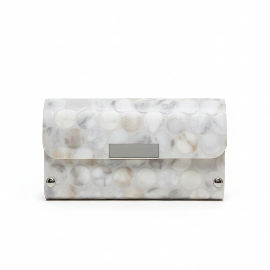 Crafted from the improbable association of upcycled vinyl flooring and wood, the 8:16 handbag is your eco-friendly, vegan friendly and socially mindful fashion accessory. Its a small size crossbody by day and your clutch-wristlet by night. This lightweight piece has just enough space for a phone, cards, keys and other sundries. It’s a novel and fun piece that WOWs a crowd yet its simple minimalist lines make it timeless.