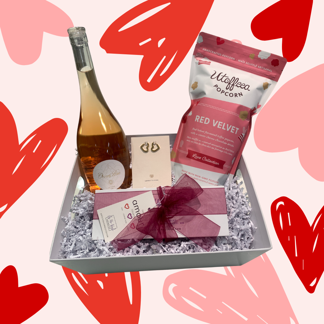 Inside, you’ll find a bottle of elegant Non Alcoholic rosé from The Sobr Market to toast to love. Paired with indulgent Red Velvet toffee popcorn from Utoffeea that blends sweet candied notes, creamy drizzle, and irresistible crunch. Delicate gold heart earrings from I AM LOVE Project add a timeless sparkle, a keepsake they’ll reach for long after the last sip is poured.