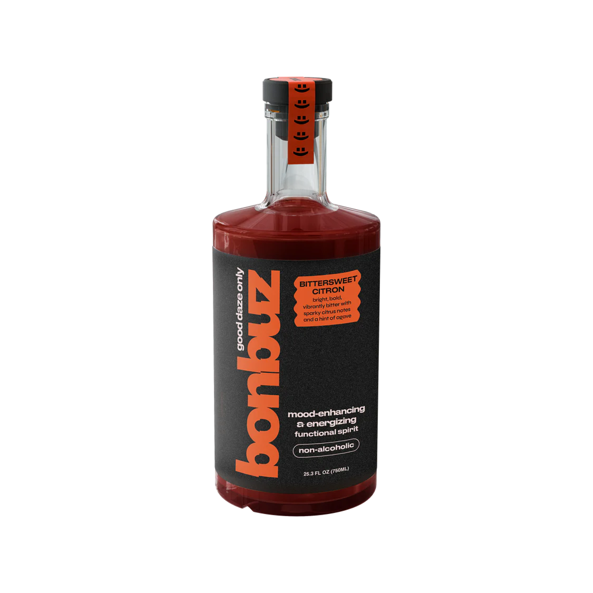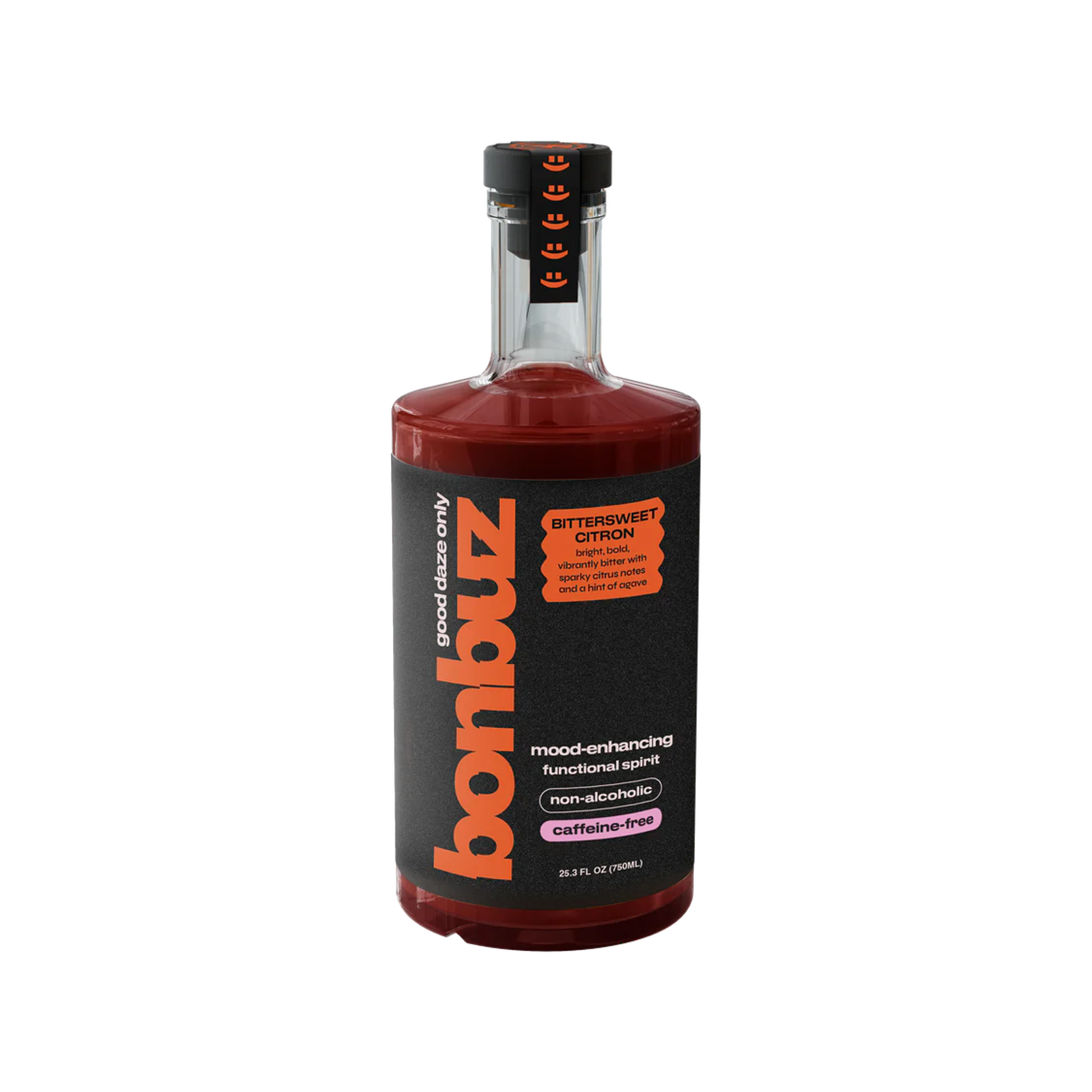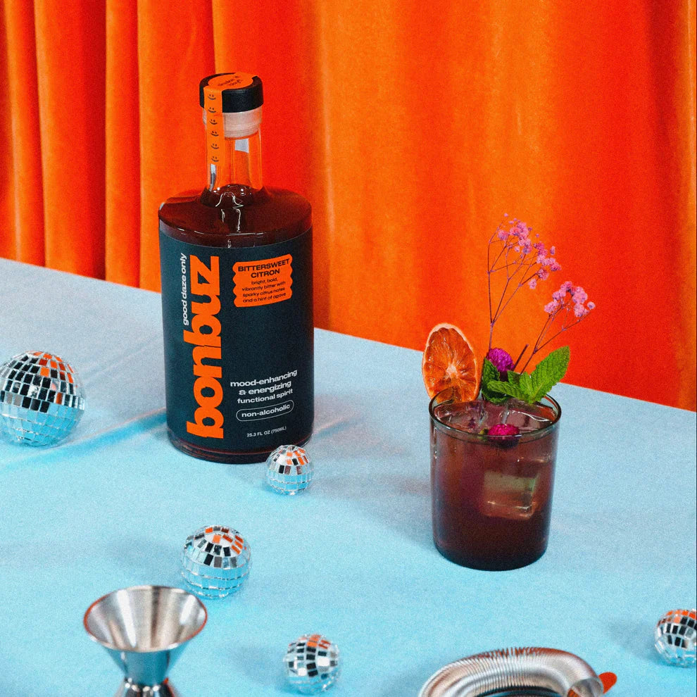 bonbuz is the first functional alcohol-free social spirit that's full of high vibes and free of alcohol. designed to stimulate the mind, shift your mood and connect more deeply, we pack a vibrantly bitter punch, with a nostalgic cola nose, and a careful combination of tart citrus, and earthiness.