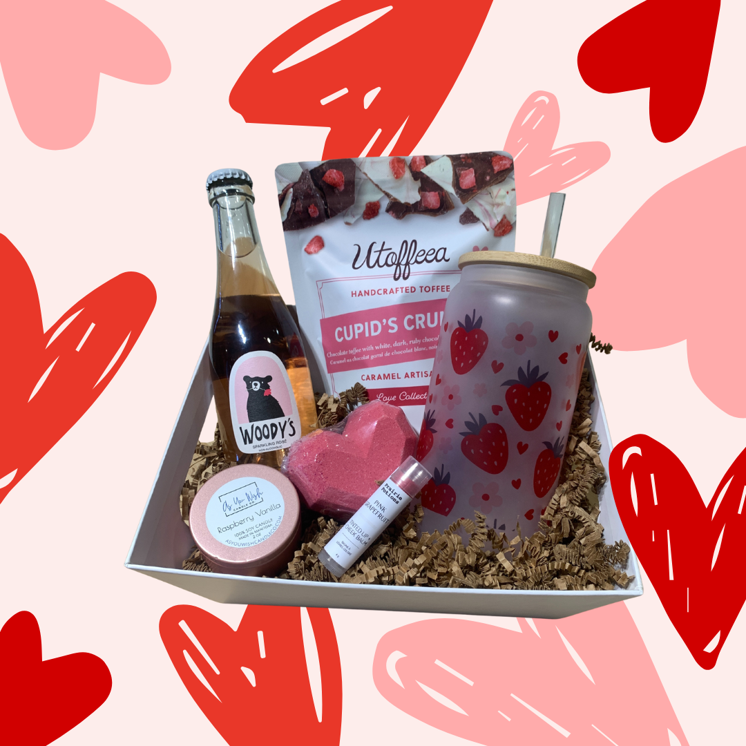 This bundle features Woody's Sparkling Rosé perfect for celebrating love, paired with Utoffeea's handcrafted Cupid’s Crunch toffee. A strawberry-themed glass tumbler adds a playful pop of charm, while Valentine-inspired self-care goodies from Happy Hippo bring a soothing, feel-good touch to the experience.